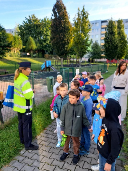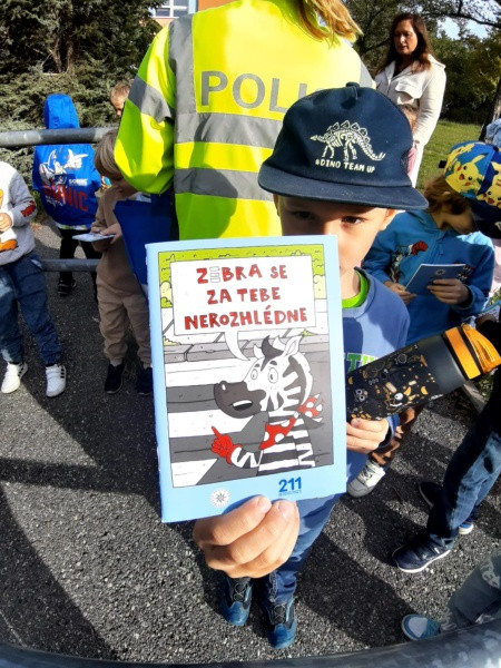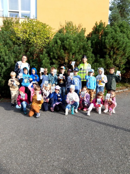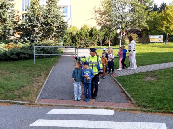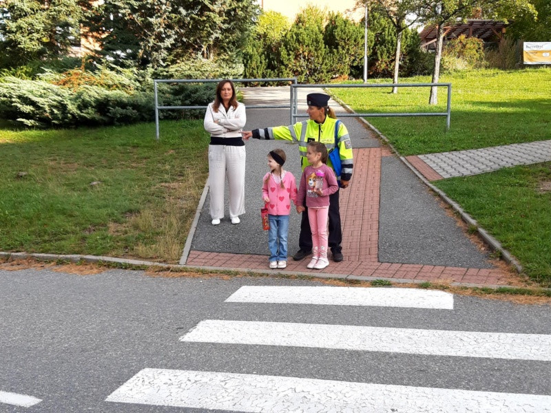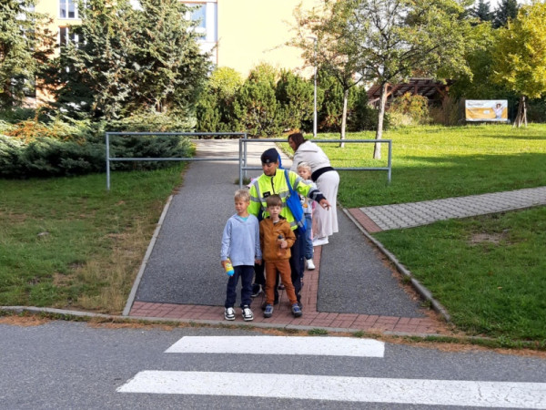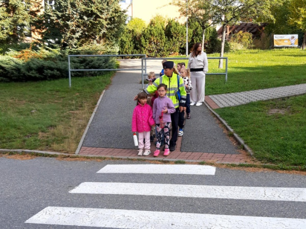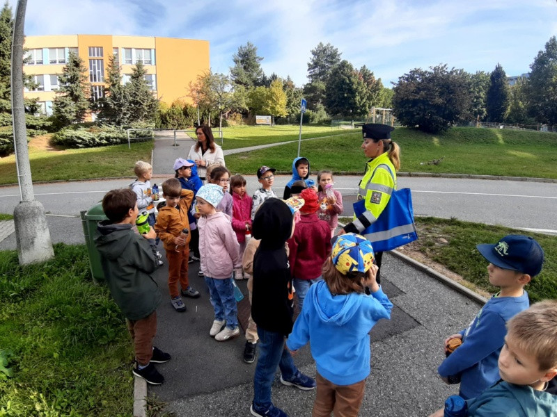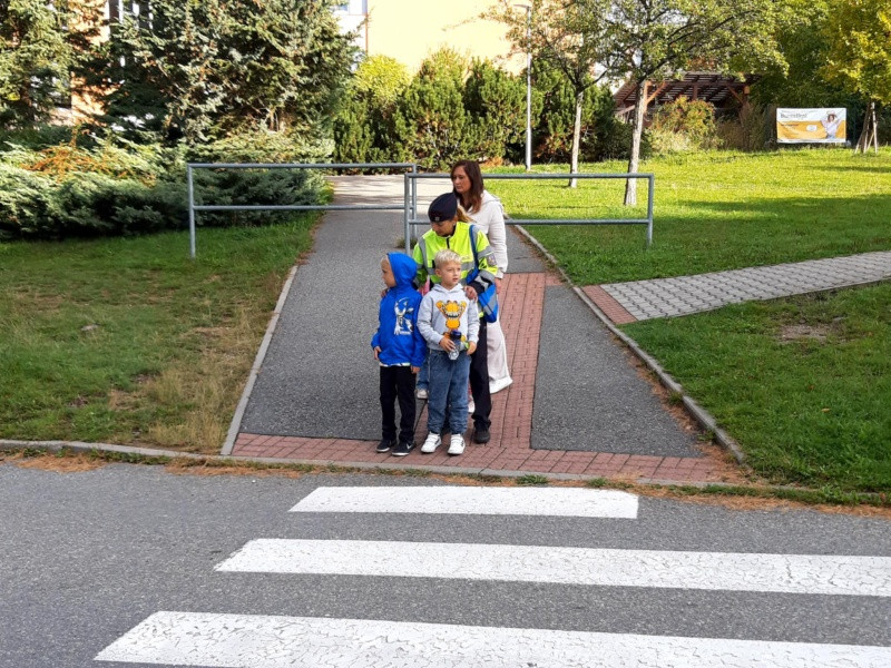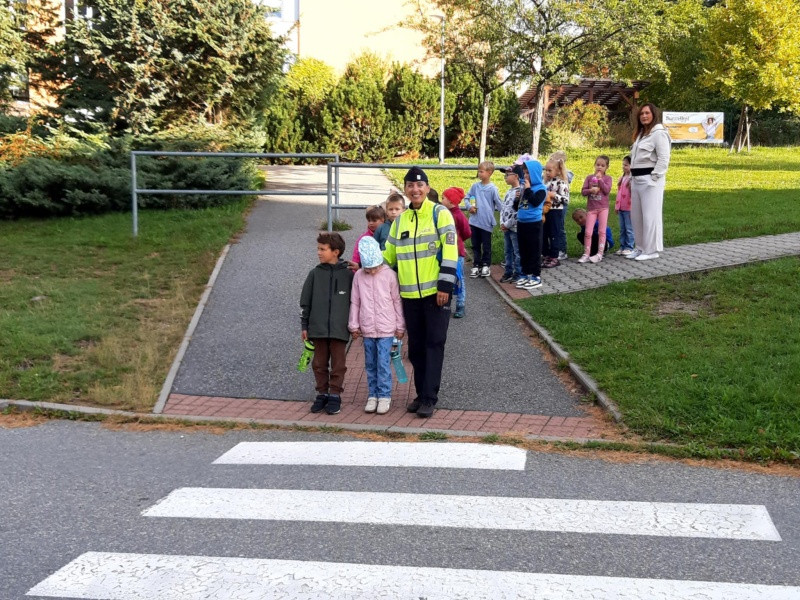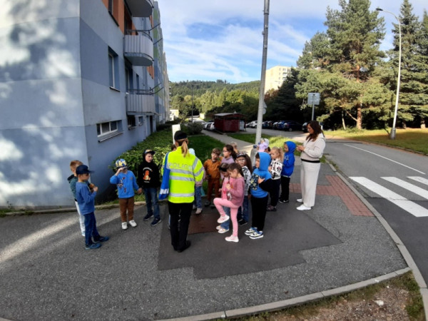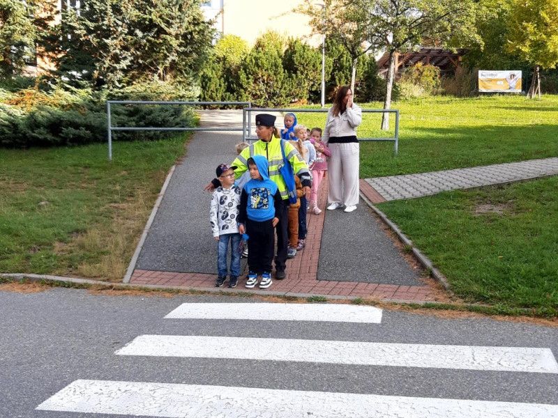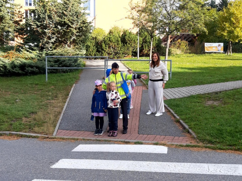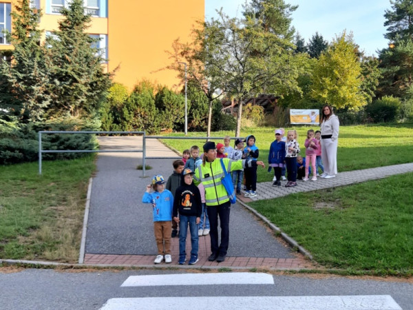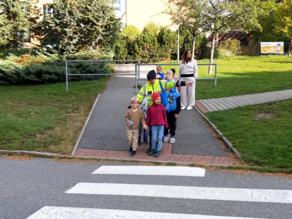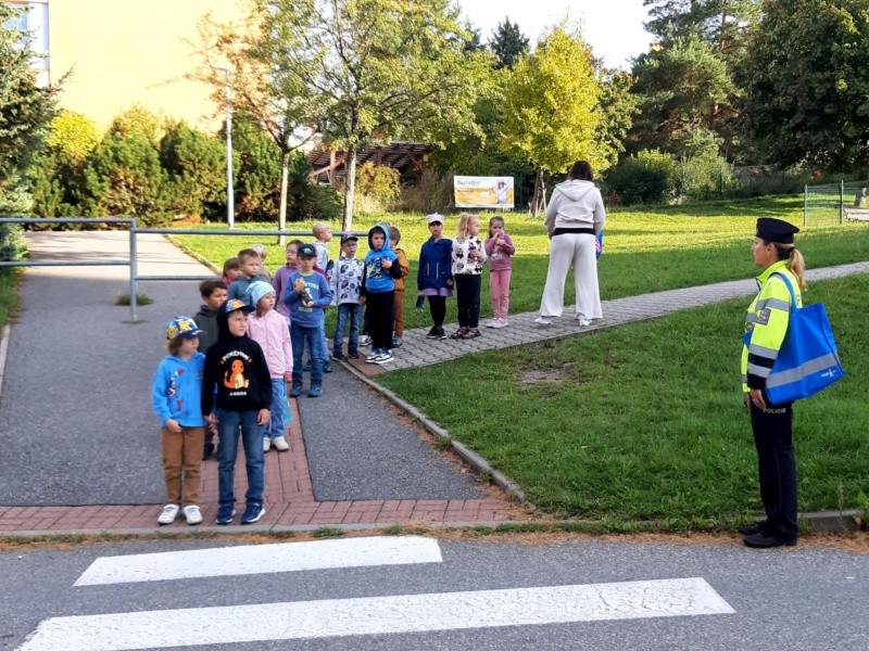 Dnes (17.9.2025) za námi přišla paní policistka Joklová a společně jsme se před školou učili správně přecházet silnici.