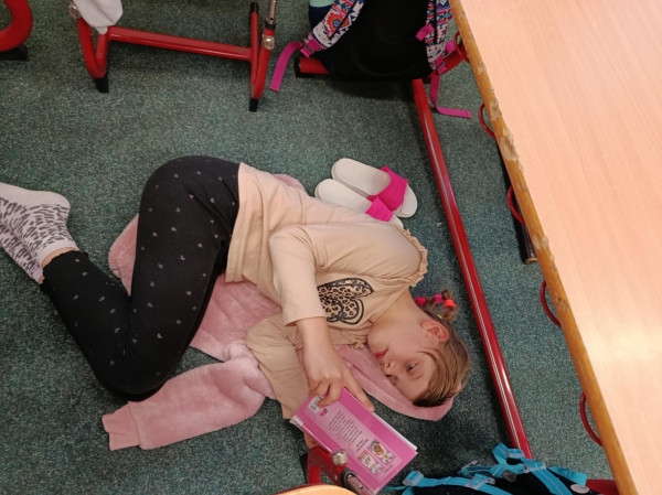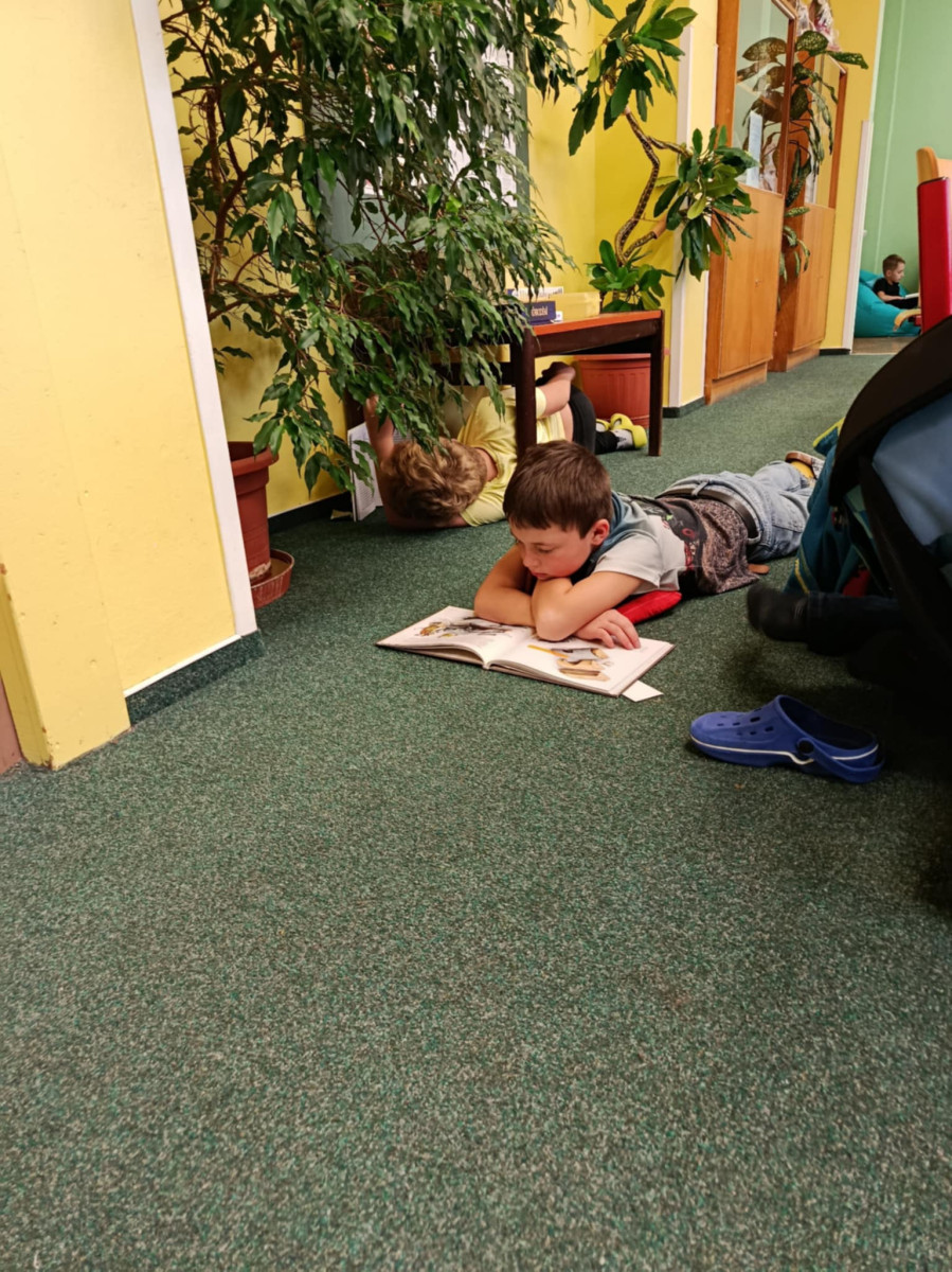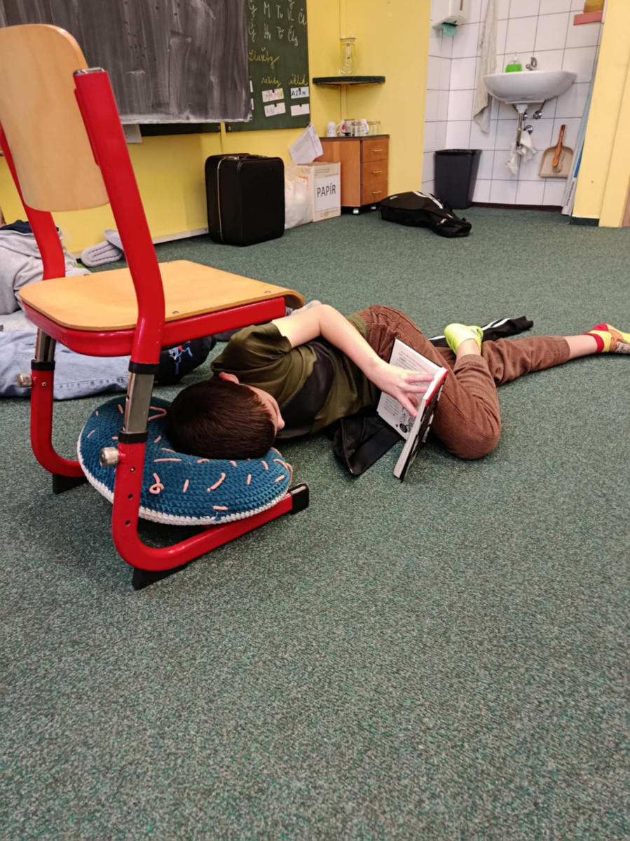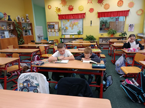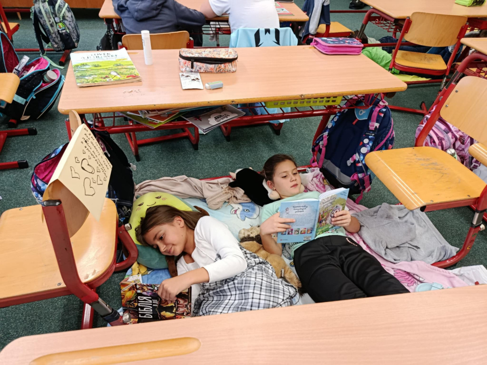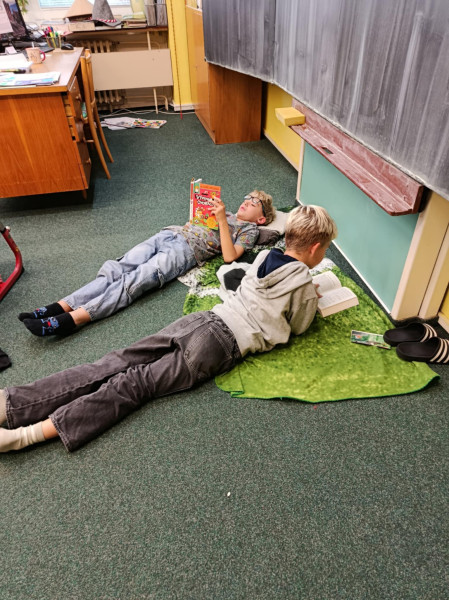 Na páteční hodinu čtení si nosíme vlastní knížku. Najdeme si příjemné místečko, vezmeme si deku, polštář a čteme a čteme a čteme... Povídáme si o knížkách, předčítáme si, plníme úkoly.