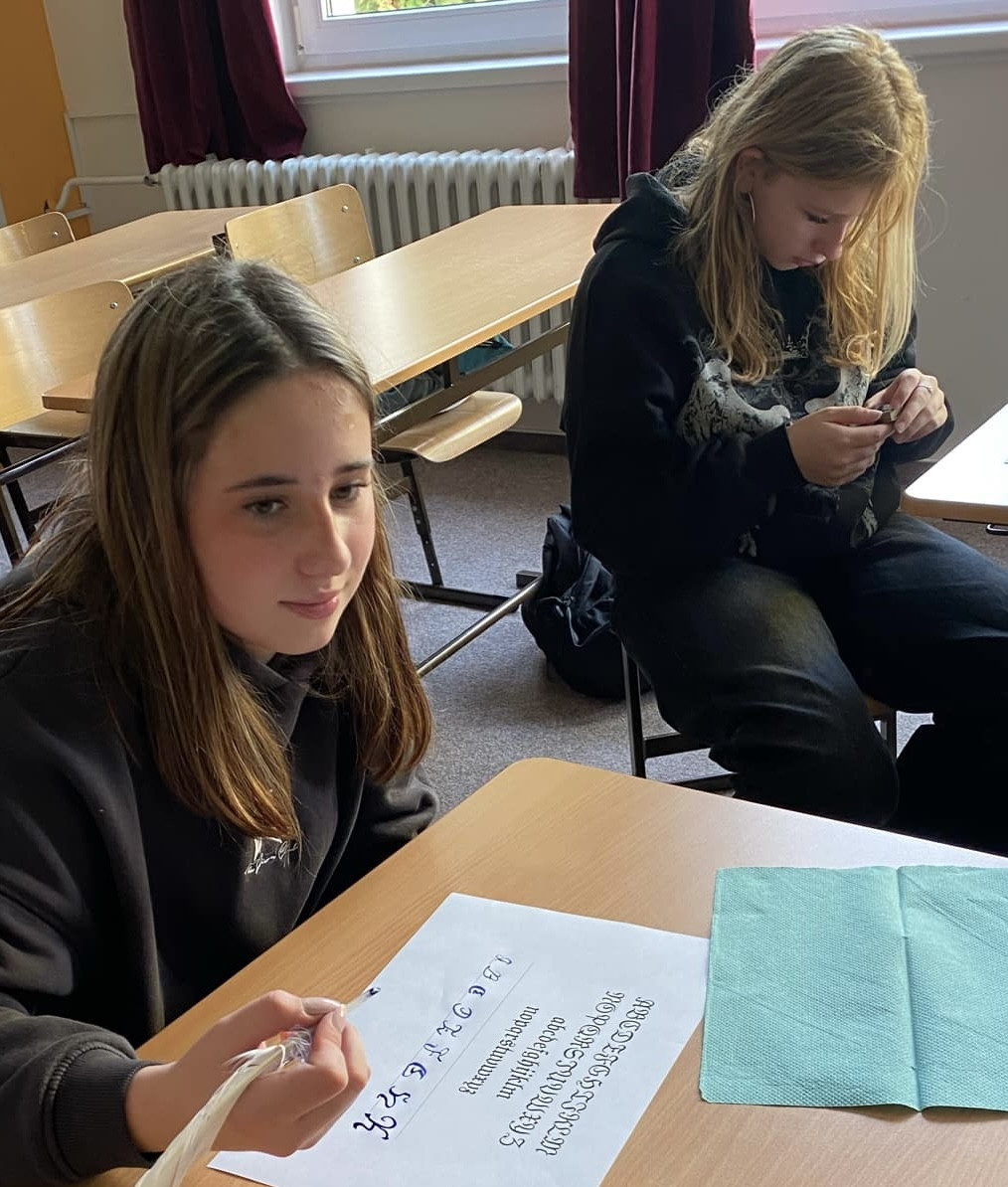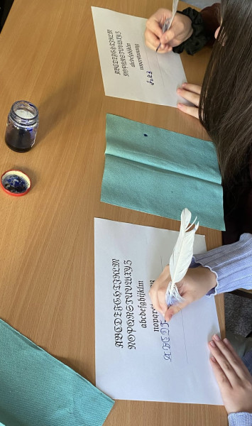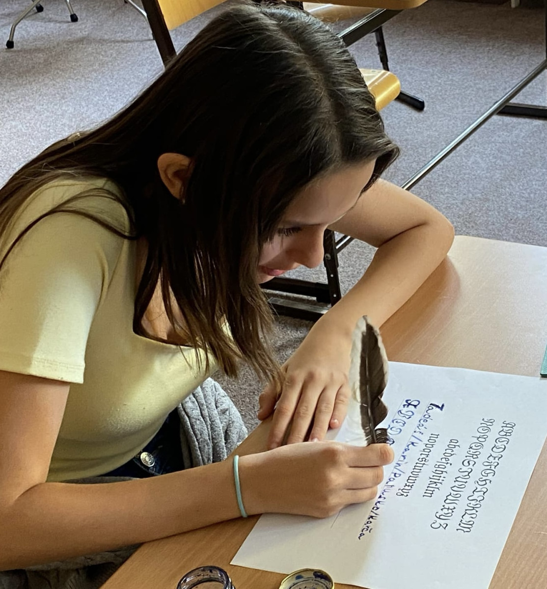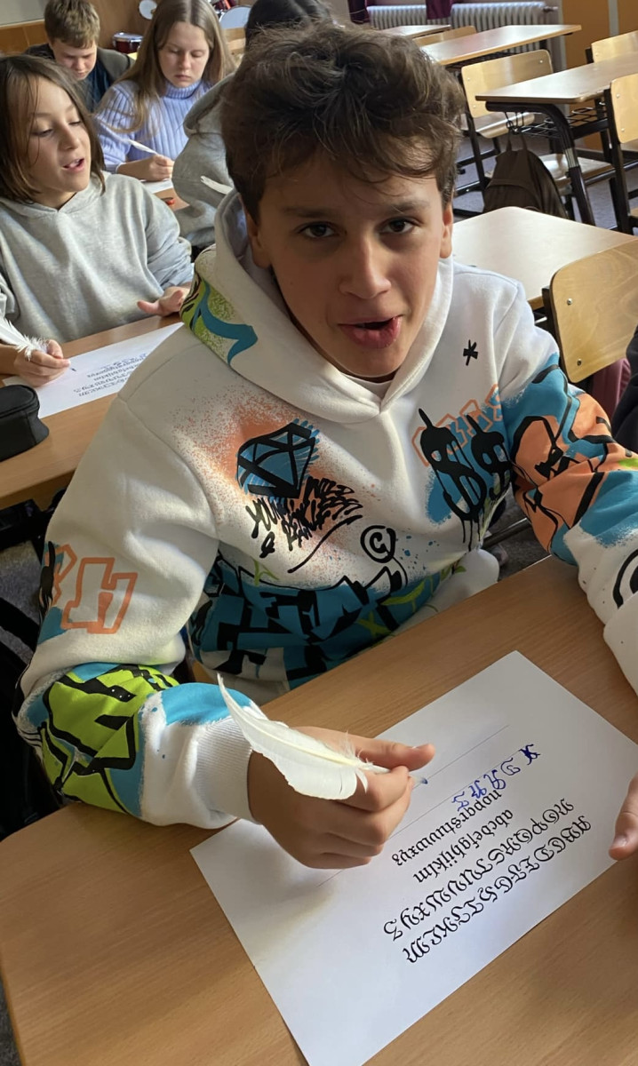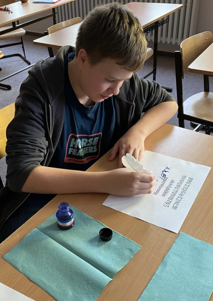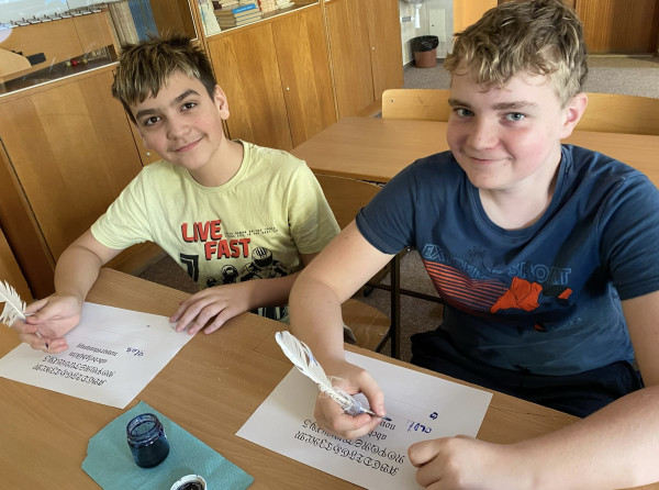 V závěru besedy jsme si vyzkoušeli práci písařů. Dostali jsme brk a inkoust a napsali ozdobným písmem svá jména. Bylo to velmi obtížné, ale zábavné. Takto psát bychom ale často nechtěli – je to velmi namáhavé.