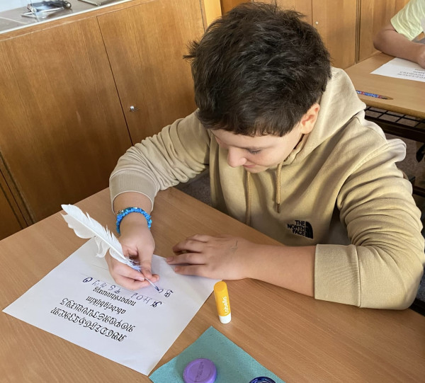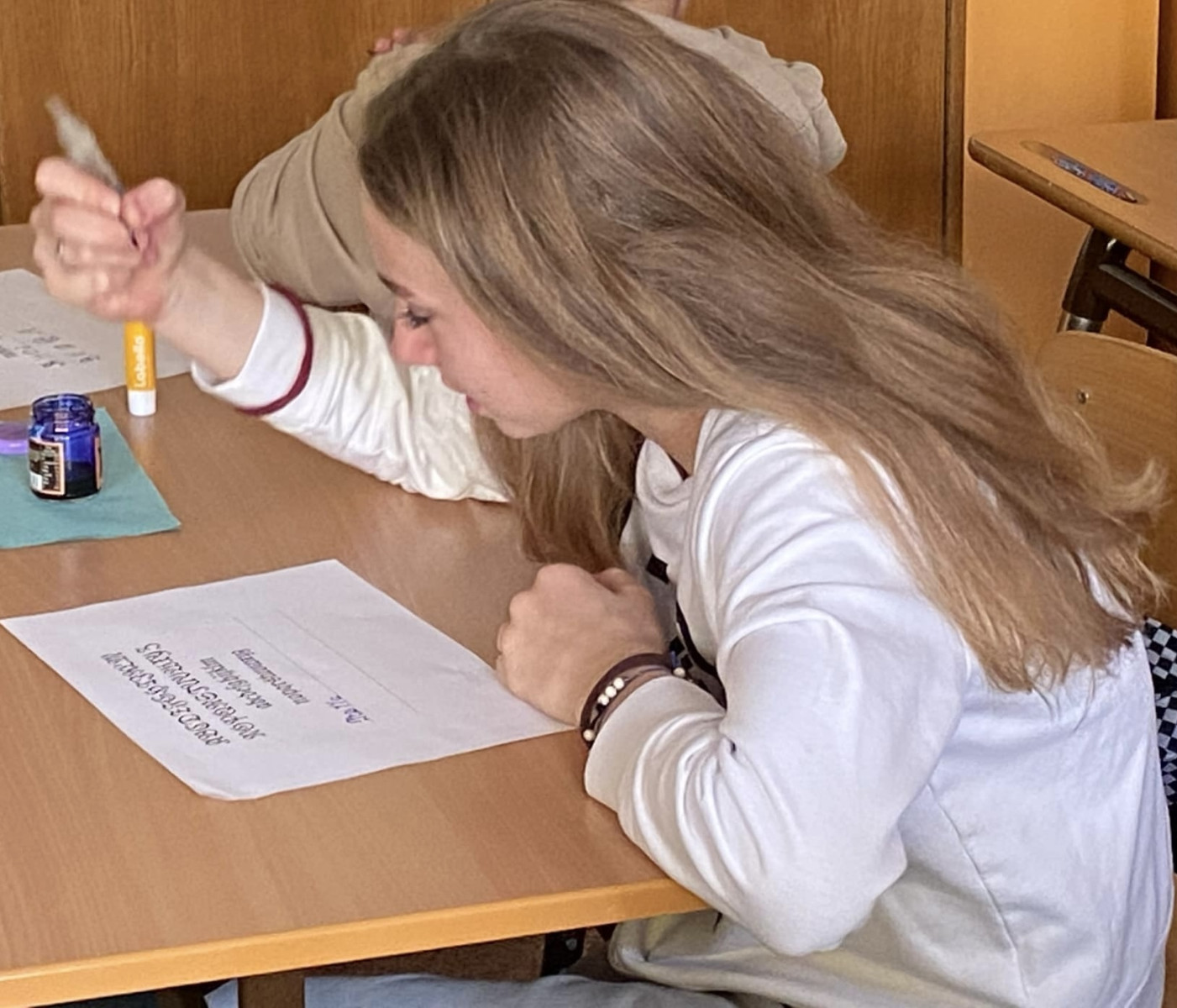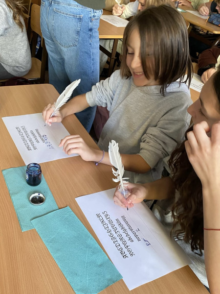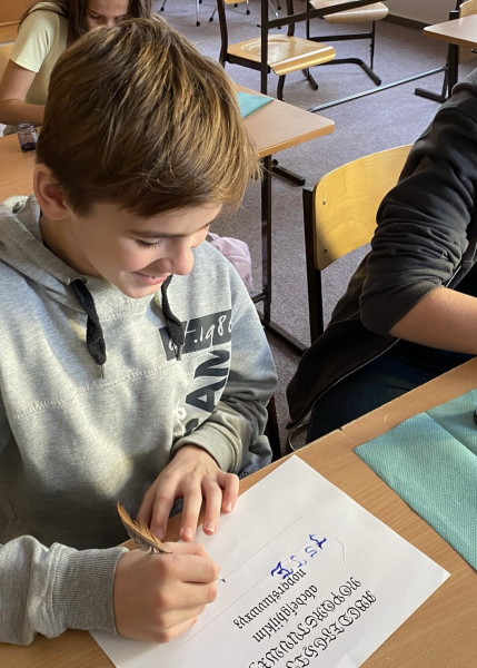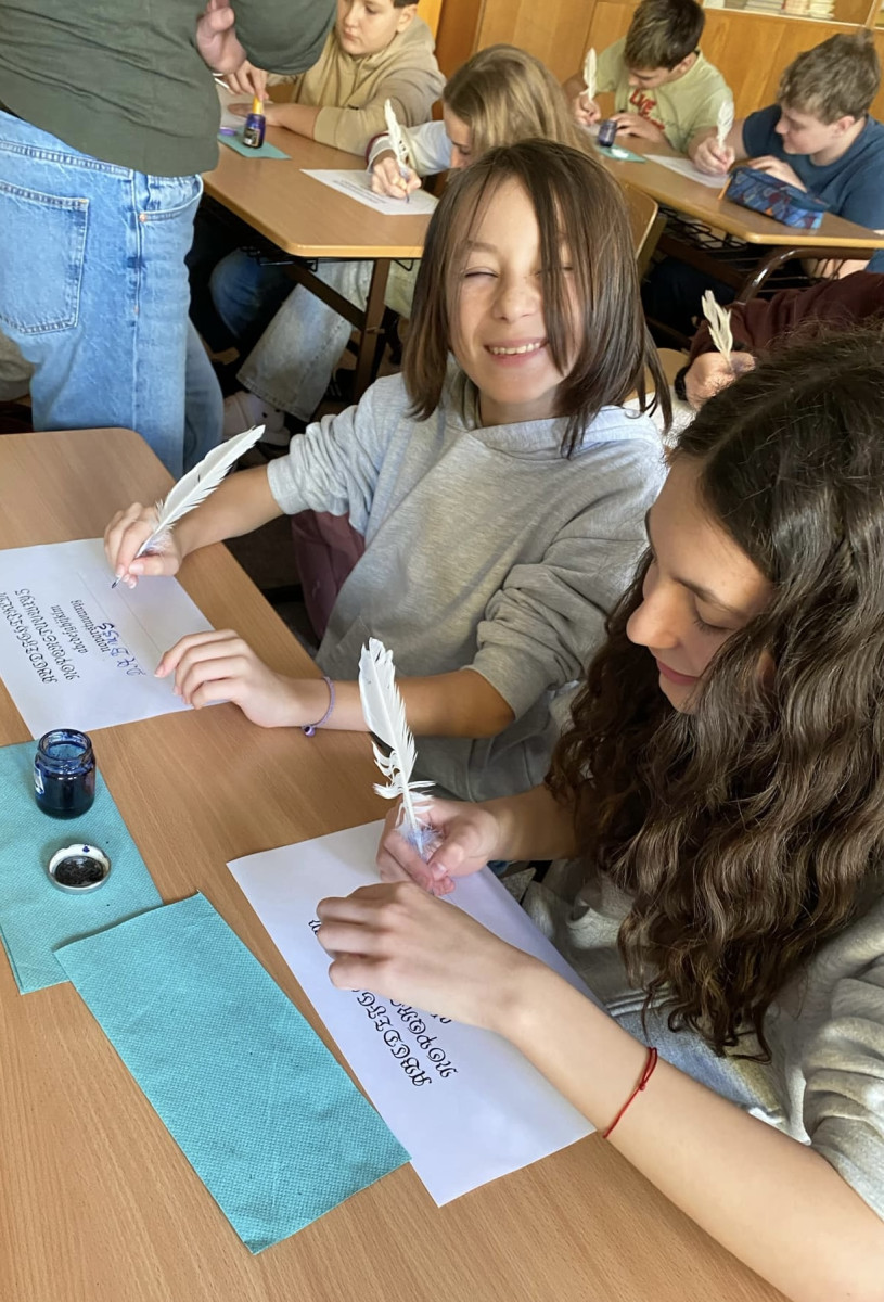 V závěru besedy jsme si vyzkoušeli práci písařů. Dostali jsme brk a inkoust a napsali ozdobným písmem svá jména. Bylo to velmi obtížné, ale zábavné. Takto psát bychom ale často nechtěli – je to velmi namáhavé.