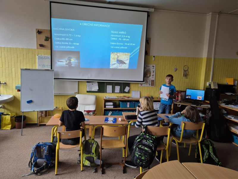 Na začátku týdne byl dostatečný prostor na dokončování všeho, čeho bylo potřeba. V rámci poznávačky objevujeme deset nových anglických slovíček týkajících se tématu voda/rybník. Při pondělní přestávce jsme si mohli udělat malý kvíz zaměřený na stromy na naší školní zahradě, který si pro nás připravil starší spolužák. Četli jsme své sci-fi příběhy, které byly velmi zdařilé. Dobrovolníci nám zarecitovali básně. Ve středu každý napsal krátký dopis, který bude předán do domova seniorů a jistě přinese mnoho radosti. Proběhly i další prezentace z tématu rybník (potrava býložravých a masožravých ryb, kachna divoká a husa velká – tvar těla a potrava, život rybníka během roku, vrba).