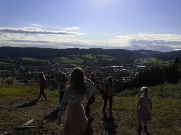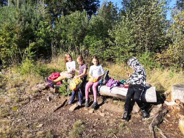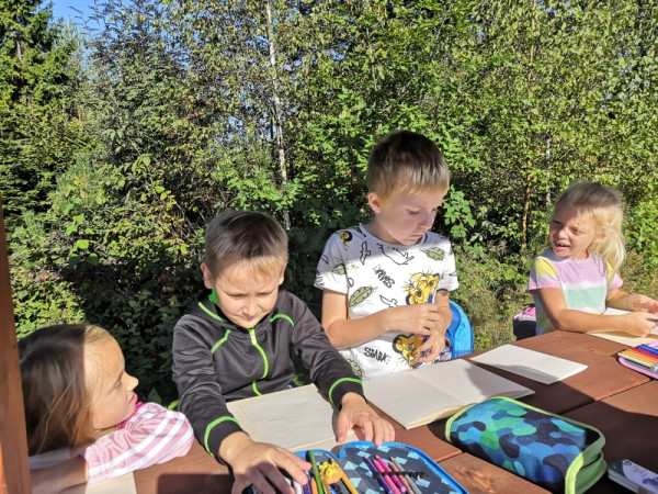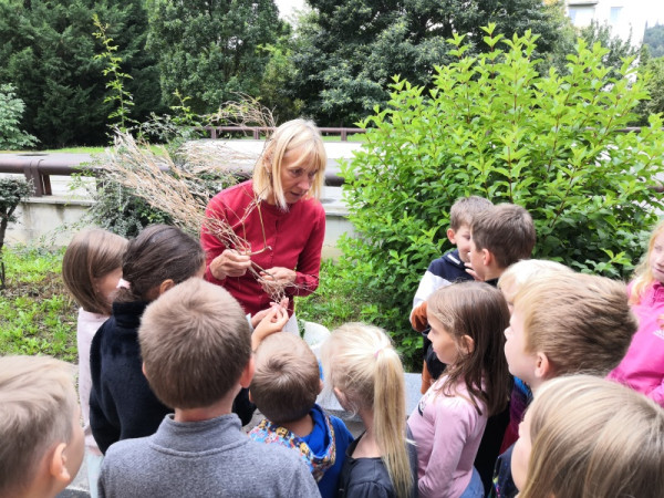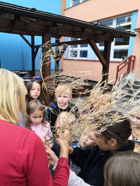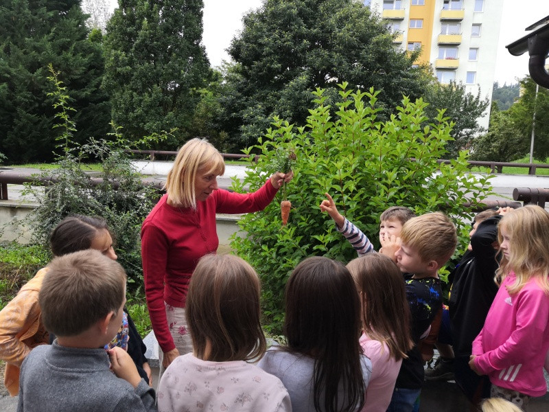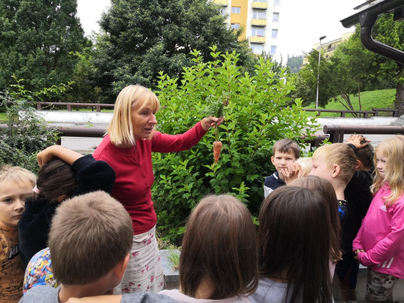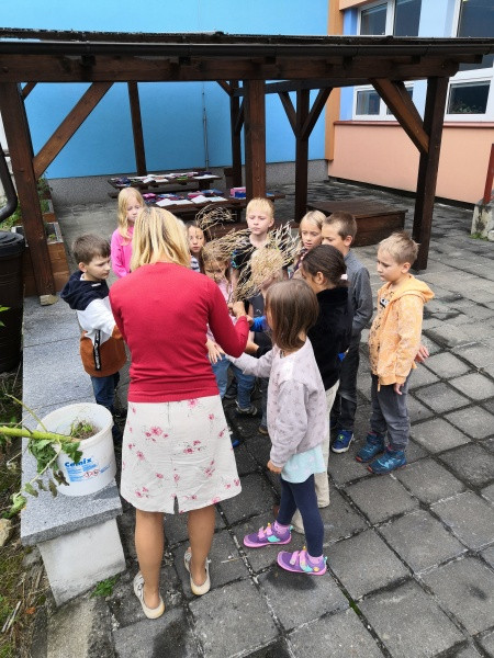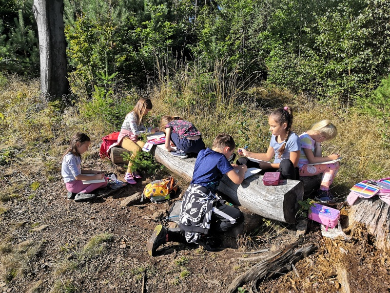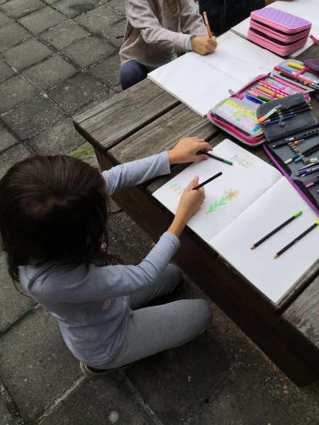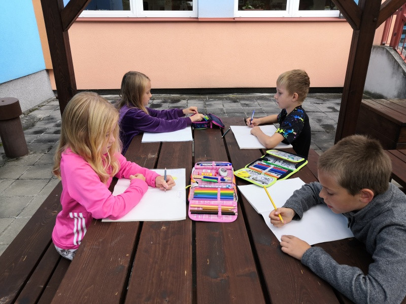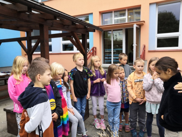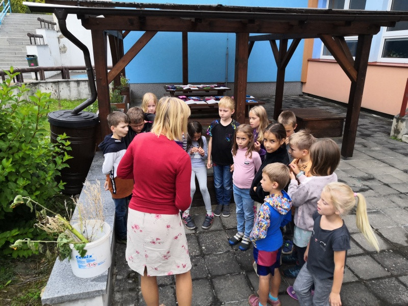 Pokud je dobré počasí, snažíme se využívat venkovní prostory (altán, terasu) k výuce. V oboru Člověk a jeho svět se zabýváme okolím školy, a rostlinami, tak se nám hodí vyjít ven. Někdy to spojíme i s ang. konverzací, kterou vede Viktorie.
