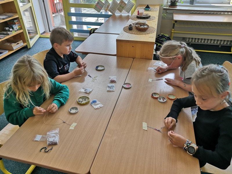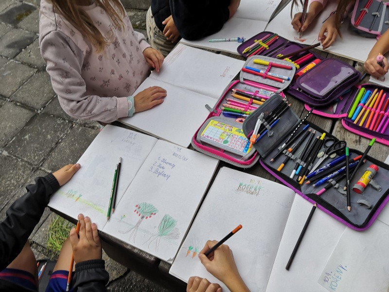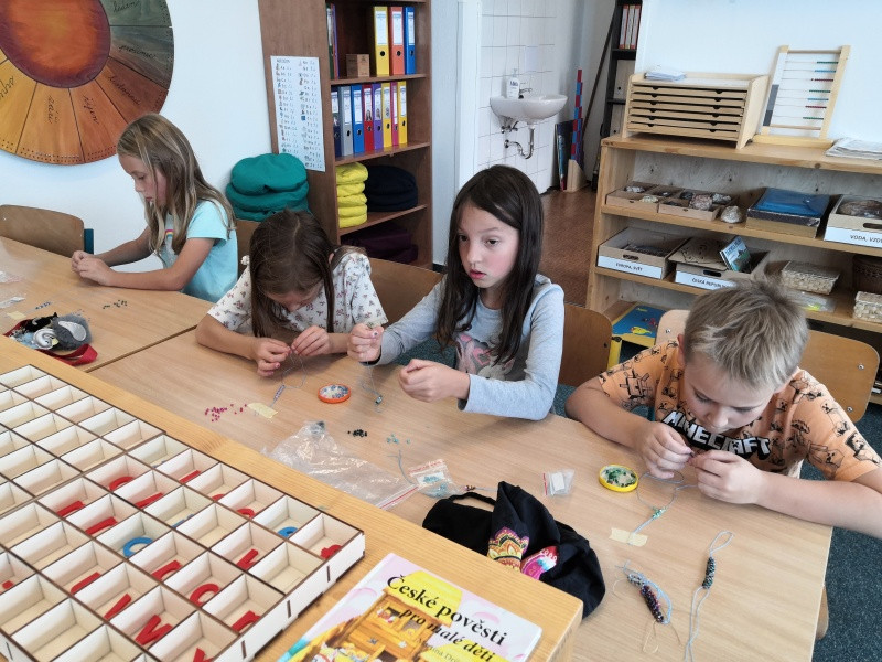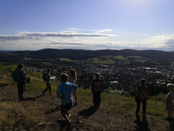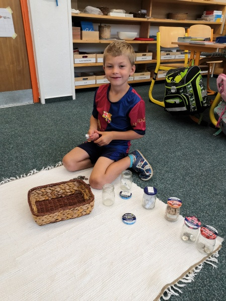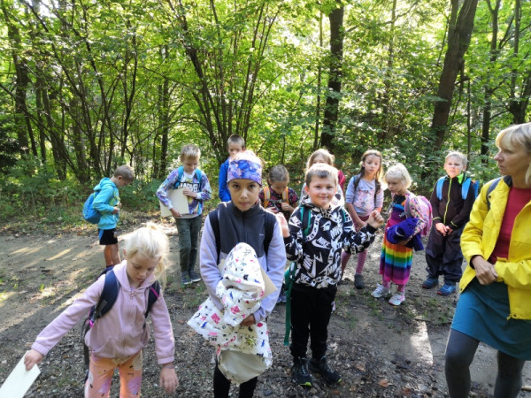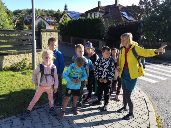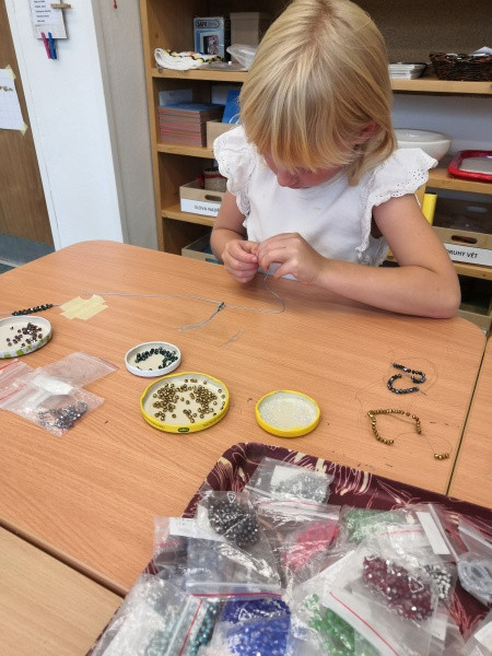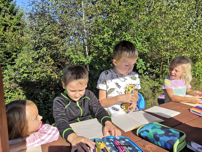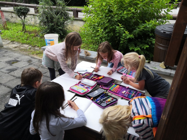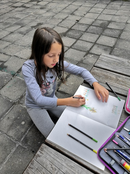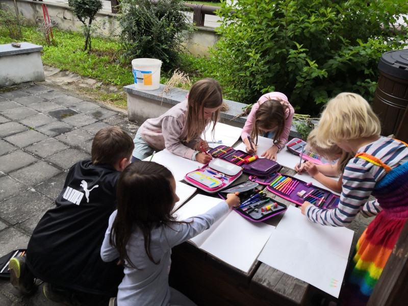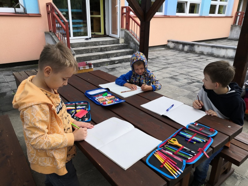 Pokud je dobré počasí, snažíme se využívat venkovní prostory (altán, terasu) k výuce. V oboru Člověk a jeho svět se zabýváme okolím školy, a rostlinami, tak se nám hodí vyjít ven. Někdy to spojíme i s ang. konverzací, kterou vede Viktorie.