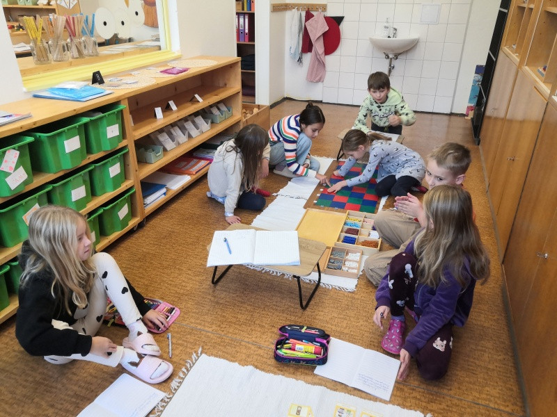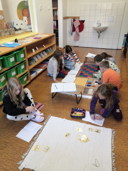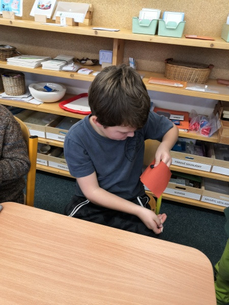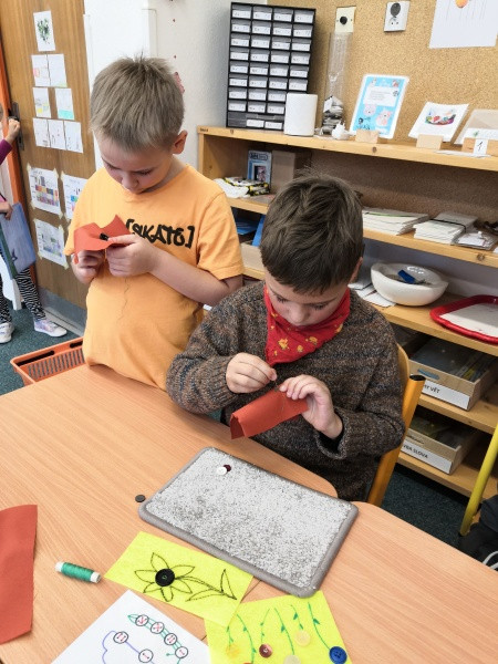 Prvňáčci začali s nácvikem psacího písma, s radostí se pustili do nové písanky. Nácvik spočívá v několika krocích-obtahování smirkového písmena, psaní do krupice, na tabuli, na tabulku, a když tvar zvládnou, pak teprve píšou do písanky.