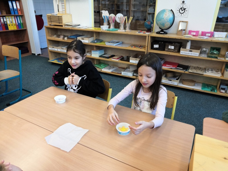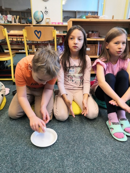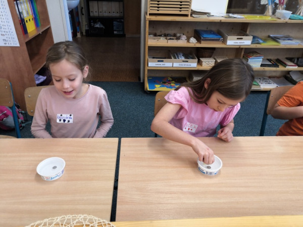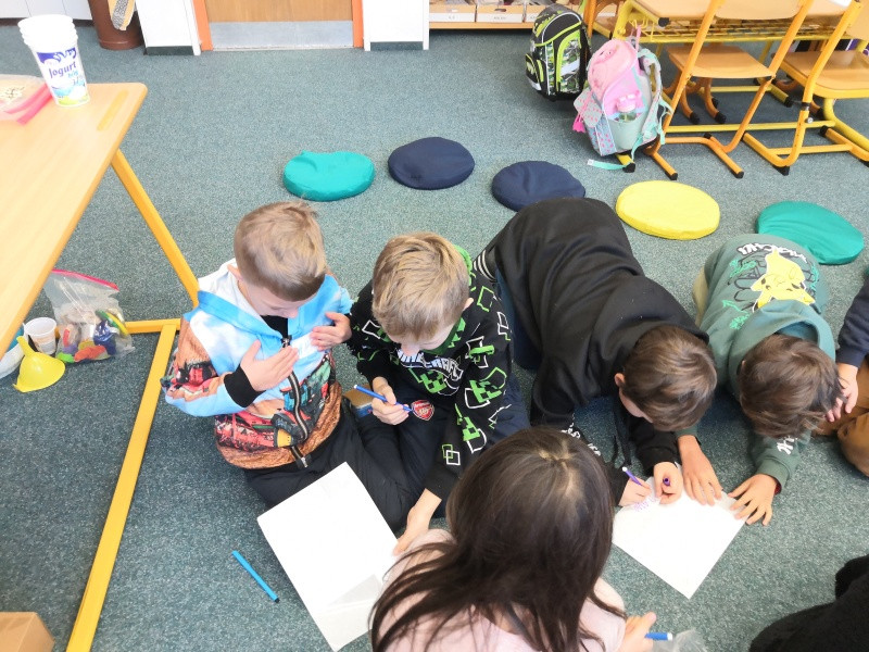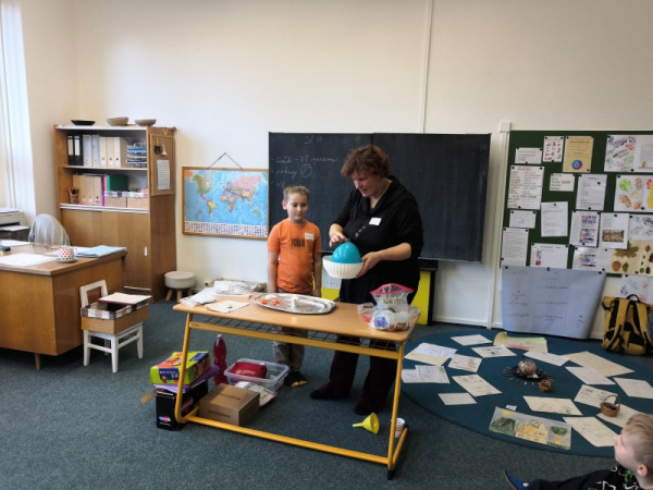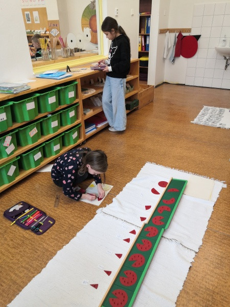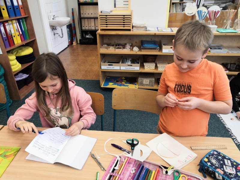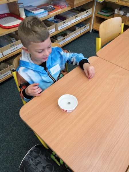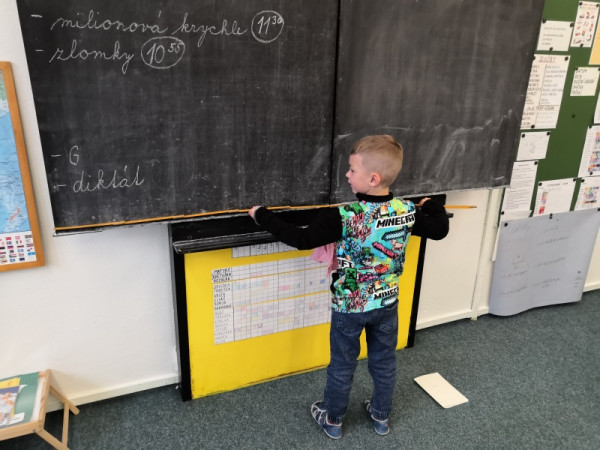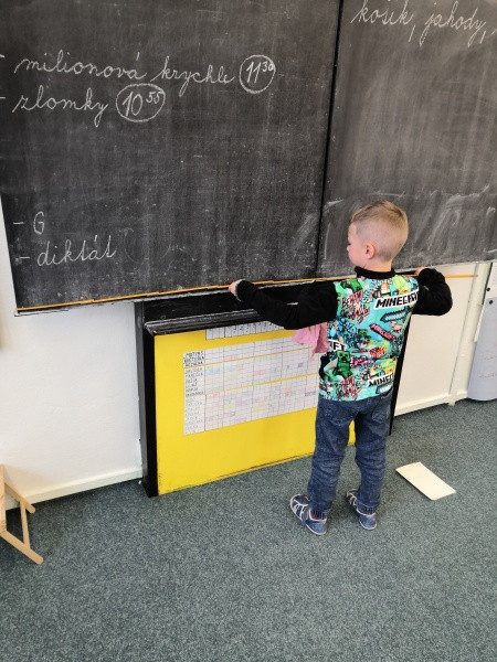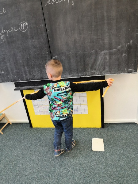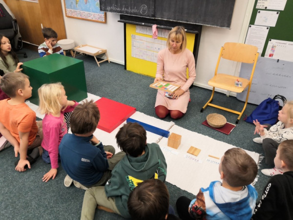 Prvňáci si poslechli příběh o měření a mohli si zkoušet měřit různými typy metrů, učili se pracovat s kartičkami na matematiku. Někteří dělili na dělící tabulce a pokračovai v písance.
