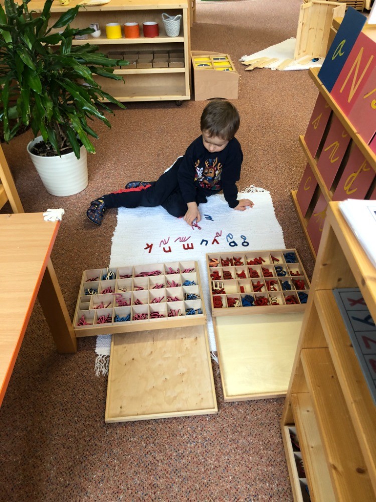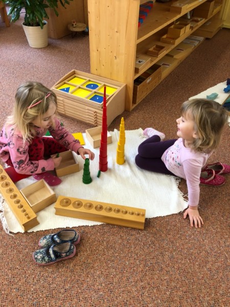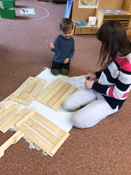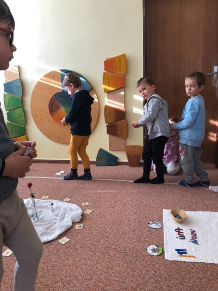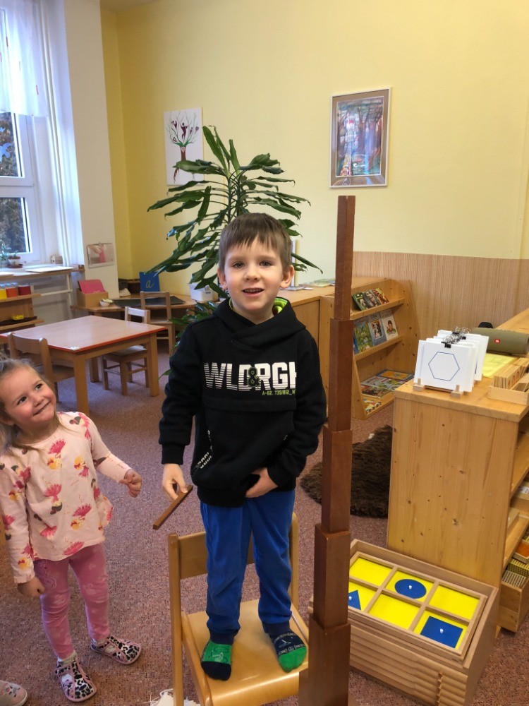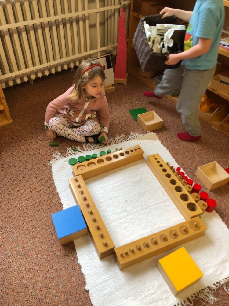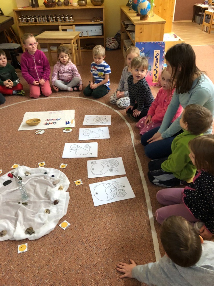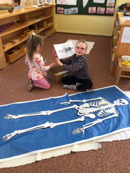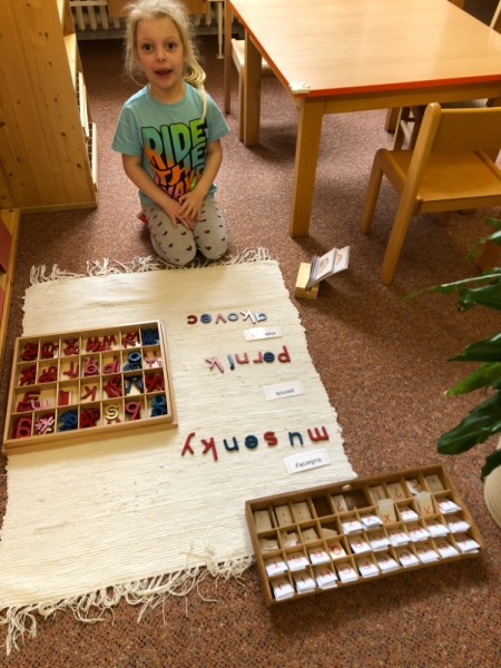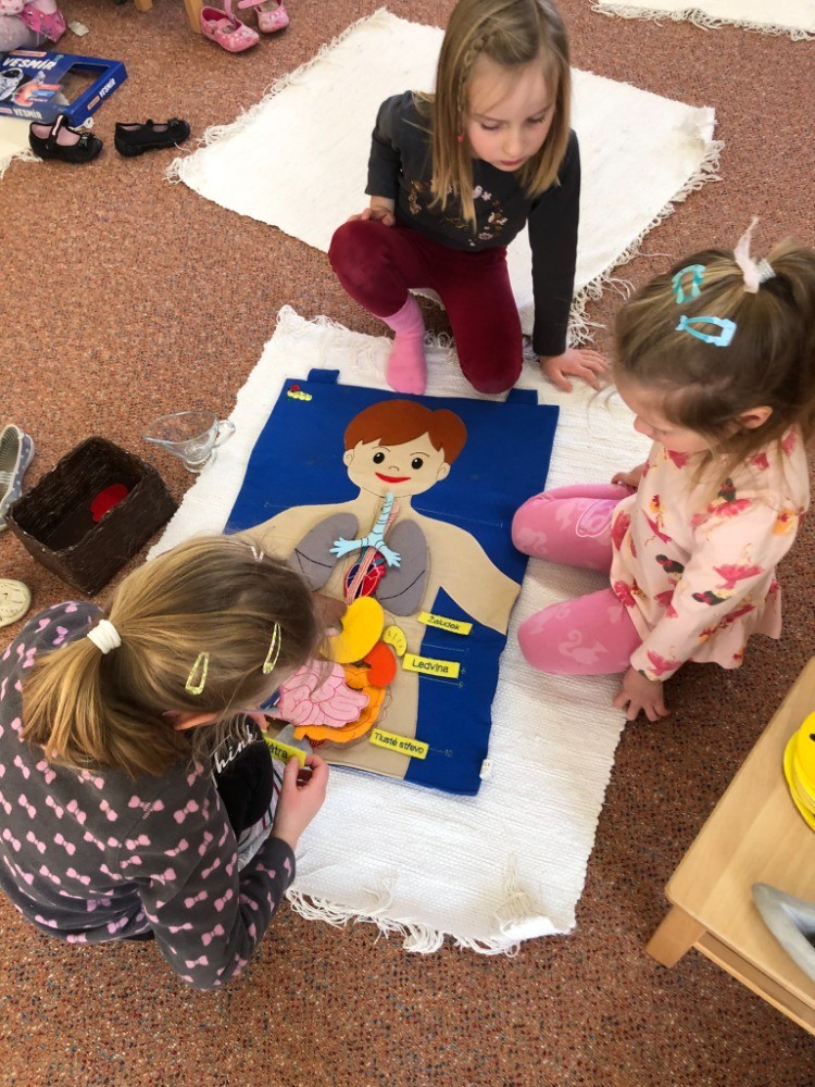Během února jsme se v rámci matematických aktivit věnovali práci s perlovým materiálem, psaní číslic, práci se sčítací proužkovou tabulkou, díky kterému děti objevovaly vztahy mezi čísly a učily se základy sčítání. Kosmická výchova nás zavedla k tématu Vesmíru – děti skládaly sluneční soustavu, prohlížely si encyklopedie a knihy o Vesmíru a skládaly vlastní Vesmír. V jazyce se zdokonalovaly ve skládání slov z pohyblivé abecedy a mnoho dětí se posunulo k dalším pokusům o psaní. Také pomůcky z praktického života a smyslové výchovy jsou u dětí neustále ve velké oblibě.
