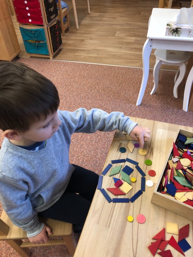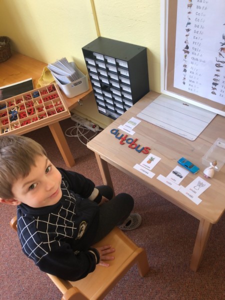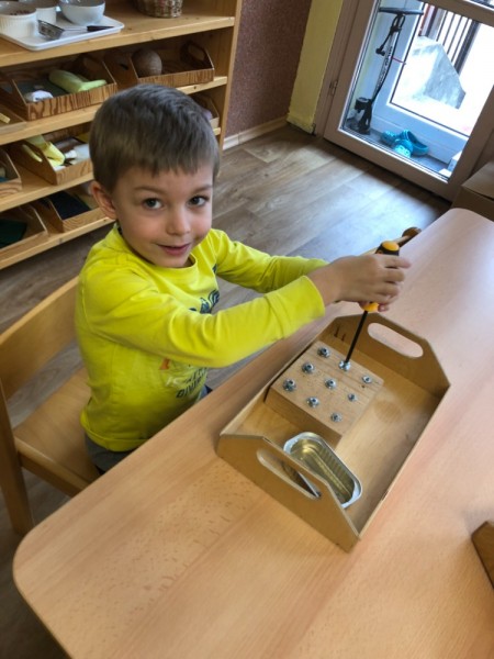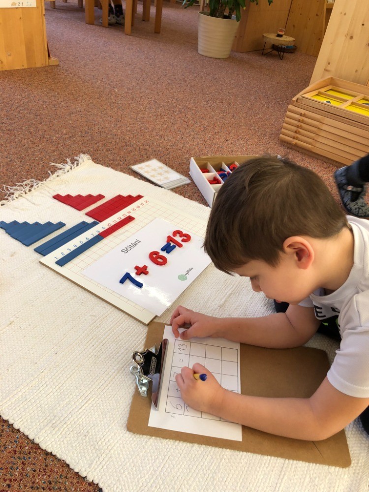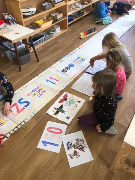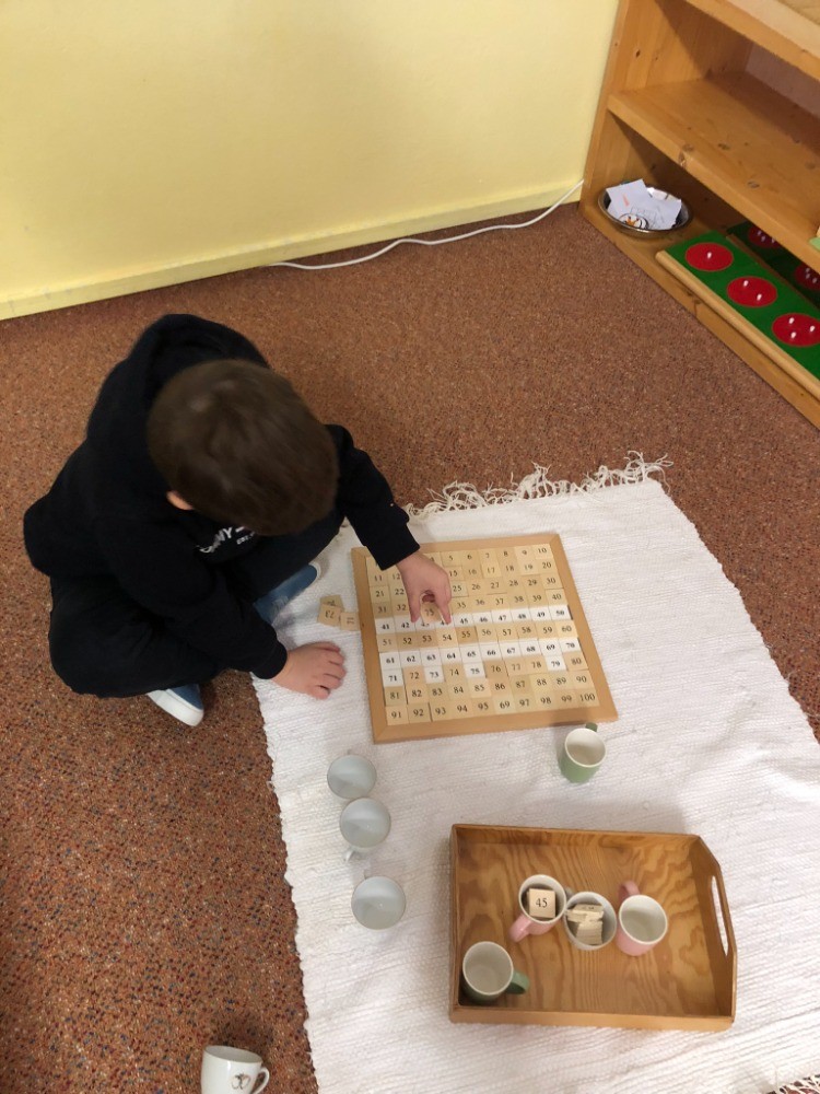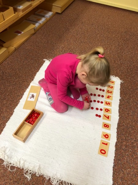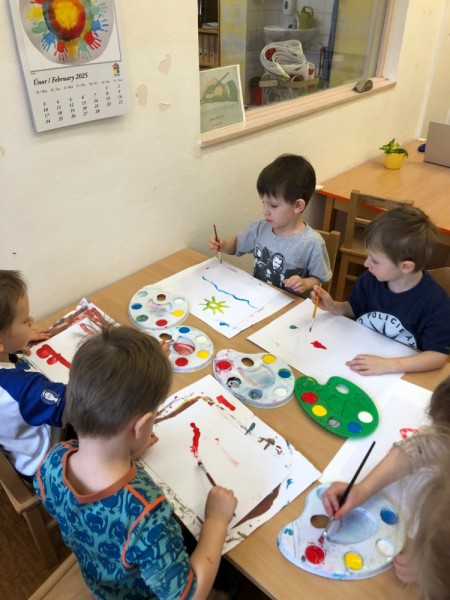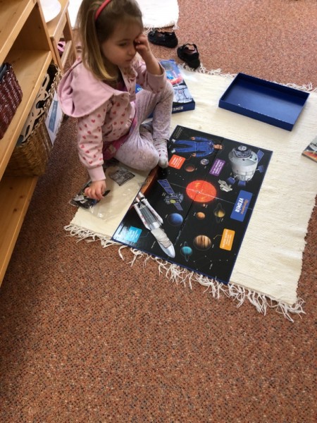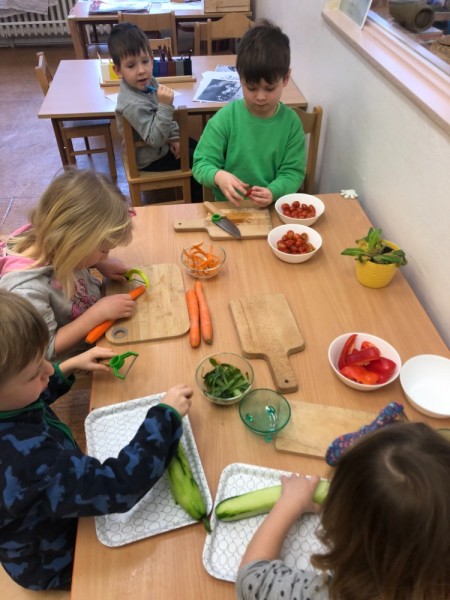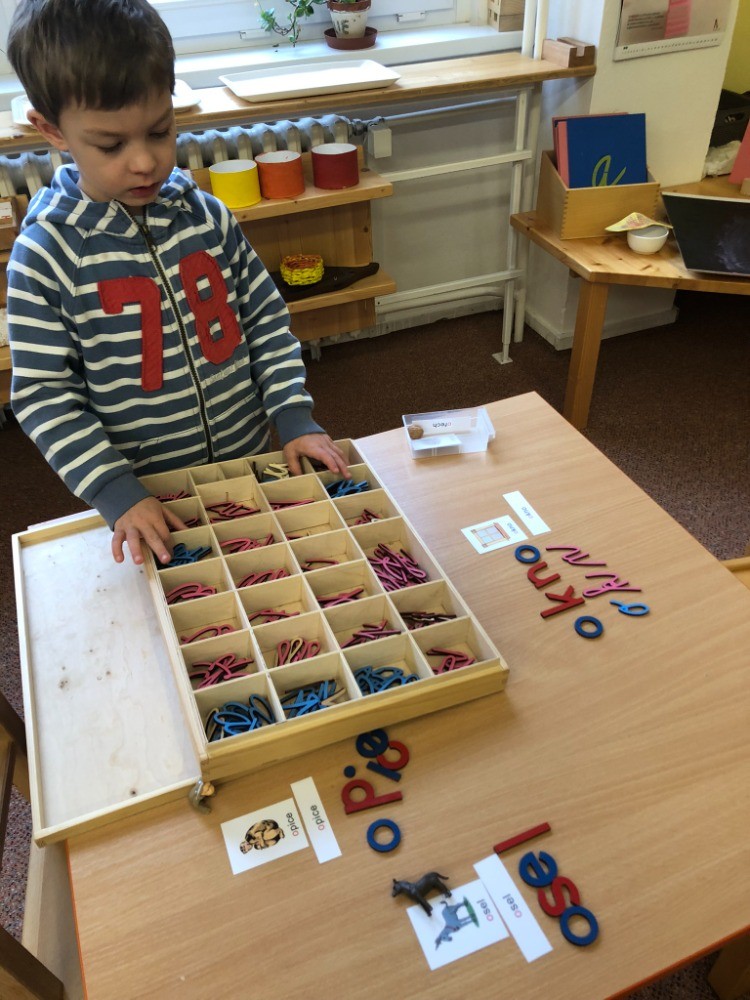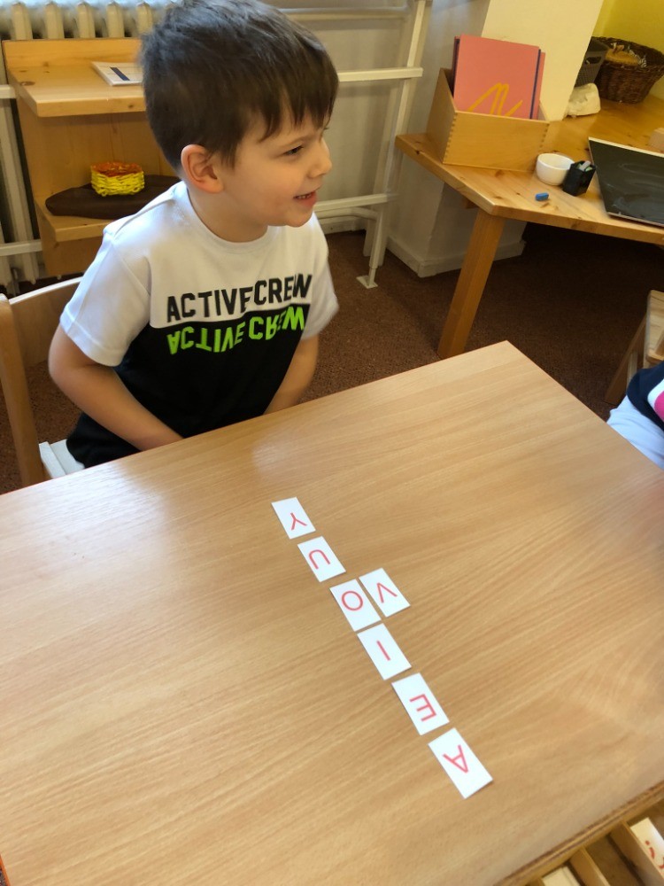 Během února jsme se v rámci matematických aktivit věnovali práci s perlovým materiálem, psaní číslic, práci se sčítací proužkovou tabulkou, díky kterému děti objevovaly vztahy mezi čísly a učily se základy sčítání. Kosmická výchova nás zavedla k tématu Vesmíru – děti skládaly sluneční soustavu, prohlížely si encyklopedie a knihy o Vesmíru a skládaly vlastní Vesmír. V jazyce se zdokonalovaly ve skládání slov z pohyblivé abecedy a mnoho dětí se posunulo k dalším pokusům o psaní. Také pomůcky z praktického života a smyslové výchovy jsou u dětí neustále ve velké oblibě.