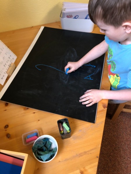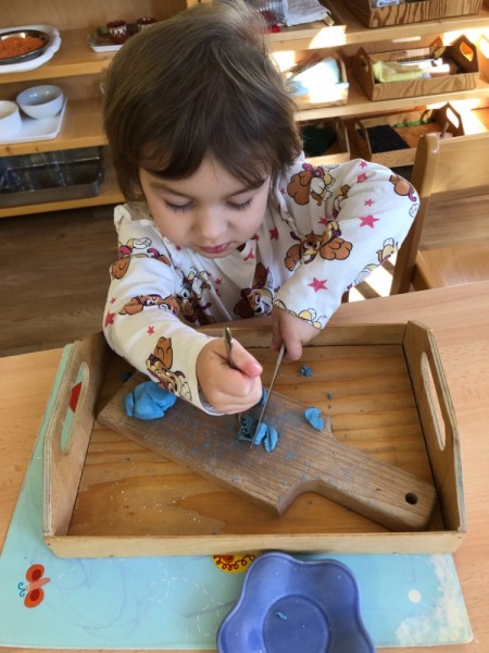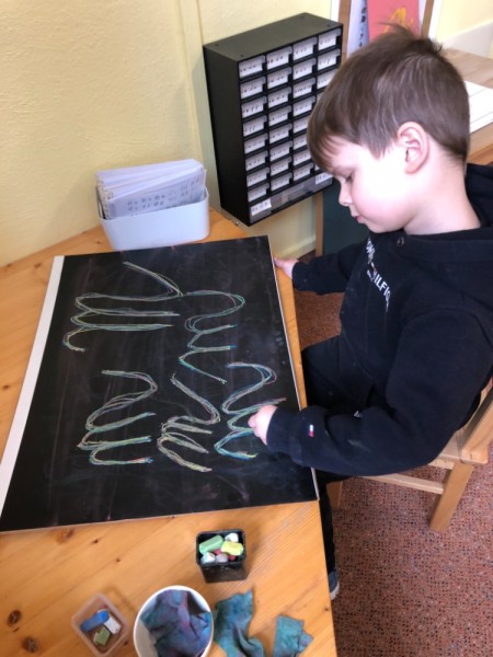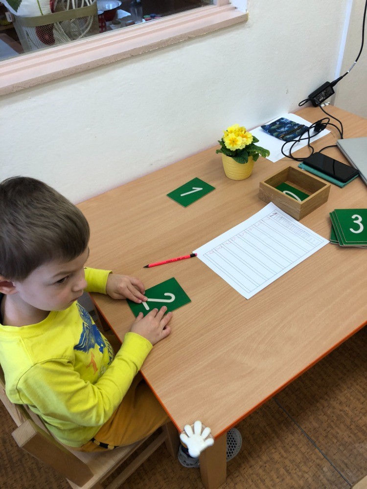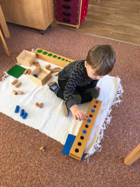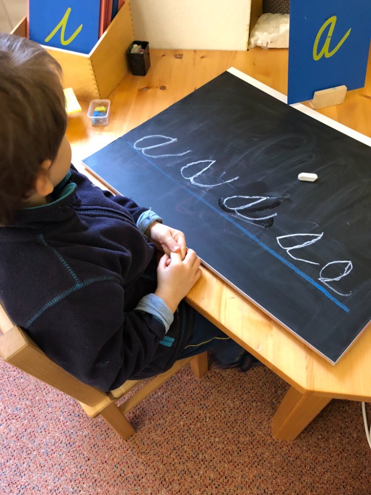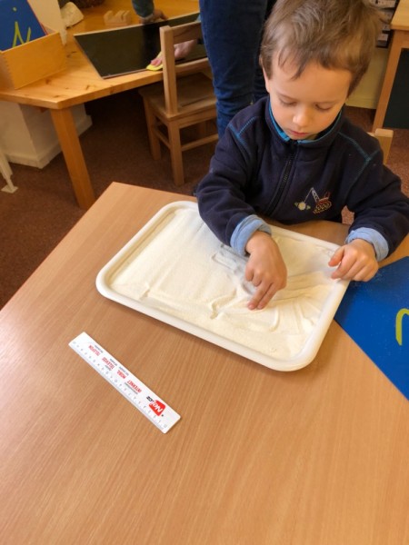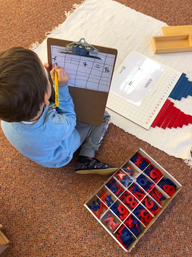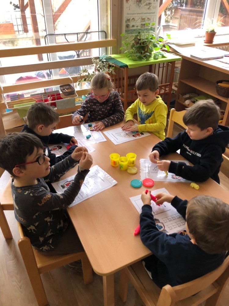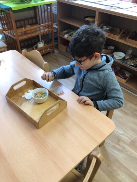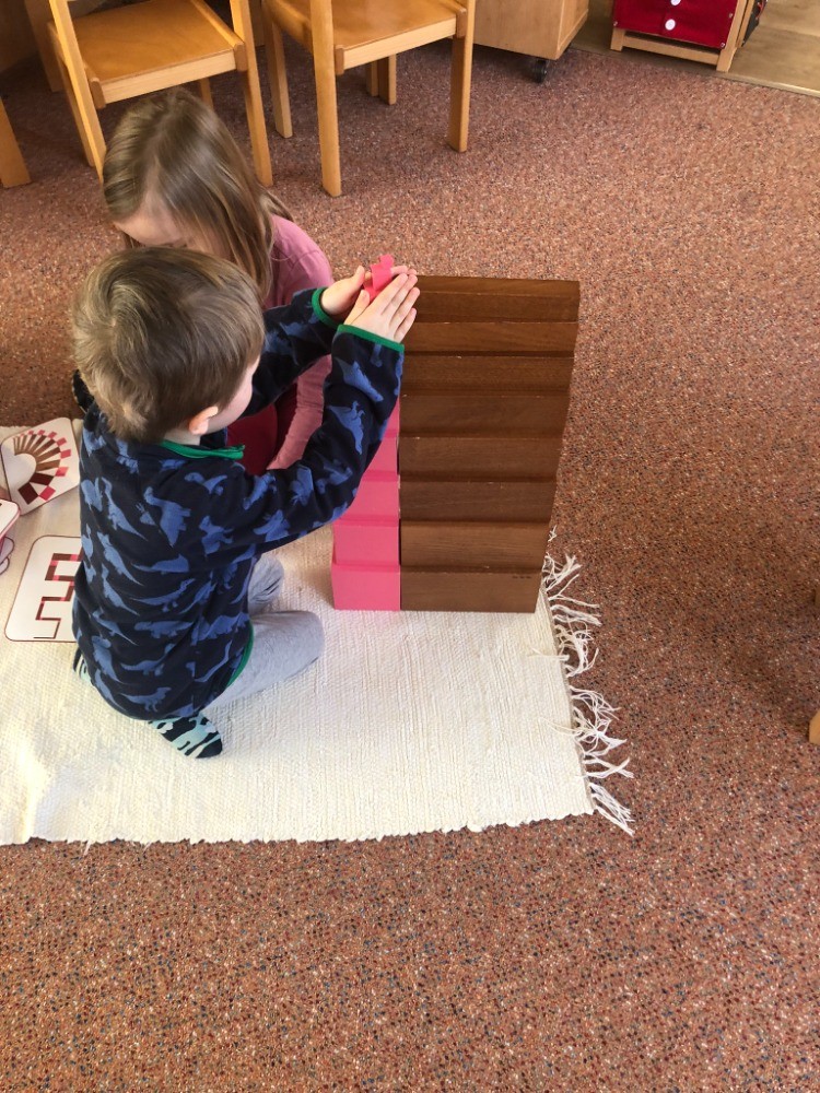 Během února jsme se v rámci matematických aktivit věnovali práci s perlovým materiálem, psaní číslic, práci se sčítací proužkovou tabulkou, díky kterému děti objevovaly vztahy mezi čísly a učily se základy sčítání. Kosmická výchova nás zavedla k tématu Vesmíru – děti skládaly sluneční soustavu, prohlížely si encyklopedie a knihy o Vesmíru a skládaly vlastní Vesmír. V jazyce se zdokonalovaly ve skládání slov z pohyblivé abecedy a mnoho dětí se posunulo k dalším pokusům o psaní. Také pomůcky z praktického života a smyslové výchovy jsou u dětí neustále ve velké oblibě.