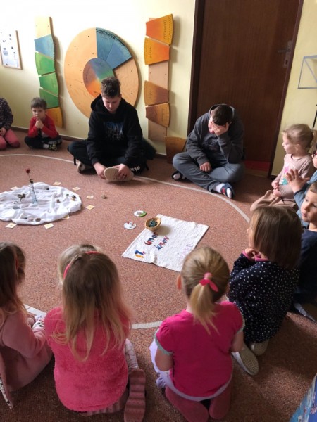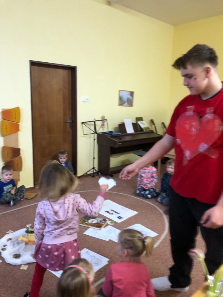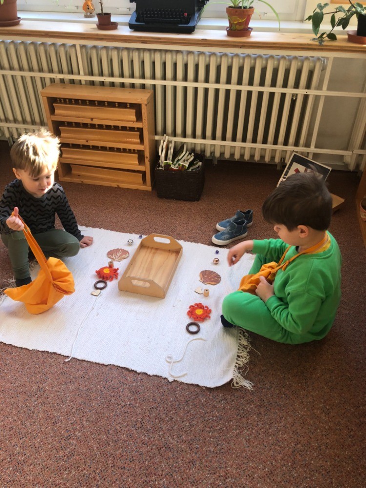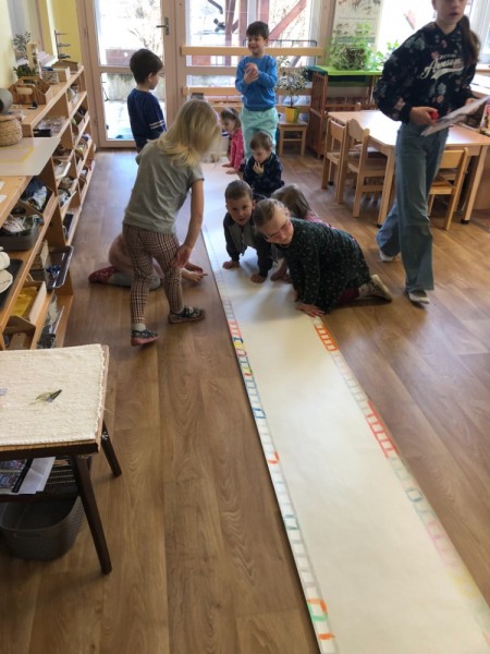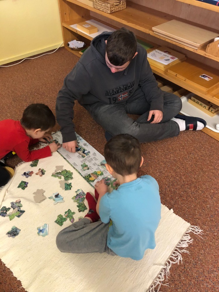 Každé pondělí po Velkém sněmu k nám zavítají sedmáci z Montessori ZŠ, kteří si v rámci přípravy na budoucí povolání zkouší, jaké to je pracovat v mateřské škole. Děti je s radostí vítají a spolu s nimi si zkouší různé aktivity – od prohlížení a čtení knih až po pomoc při práci s montessori pomůckami. Je krásné sledovat, jak starší děti přirozeně vstupují do role průvodců a inspirují ty mladší.