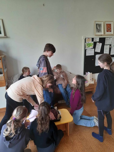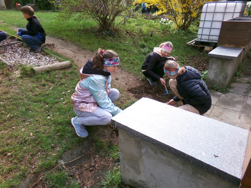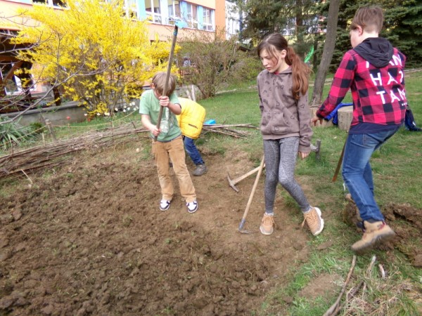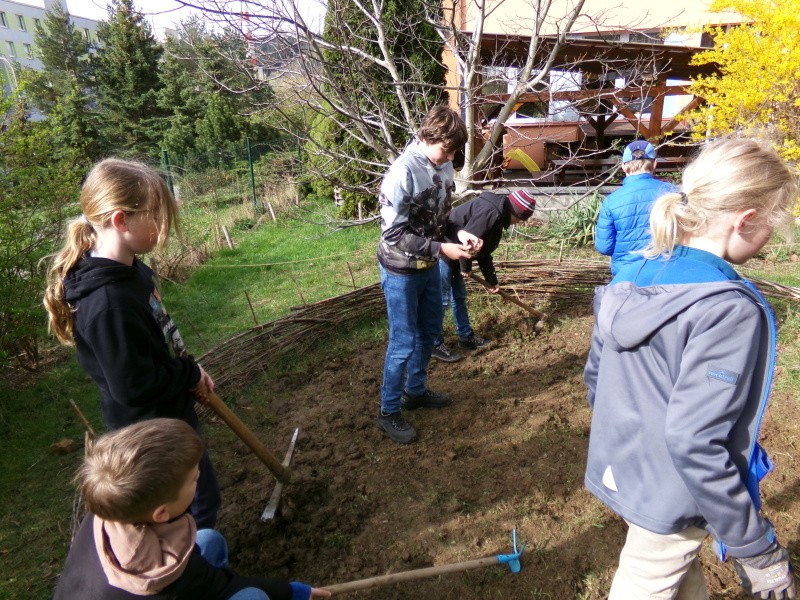 Pátek jsme začali třídním sněmem a pak jsme šli pracovat na zahradu - Muselo se zrýpat blátovište, vyčistit bosý chodníček, zkrotit vrbičky a naplnit hmyzí domeček. Udělali jsme velký kus práce a pobyt na vzduchu nám všem moc prospěl.