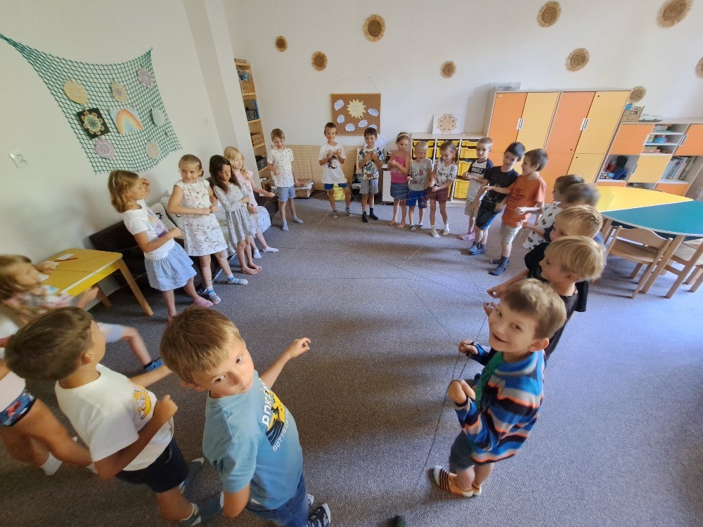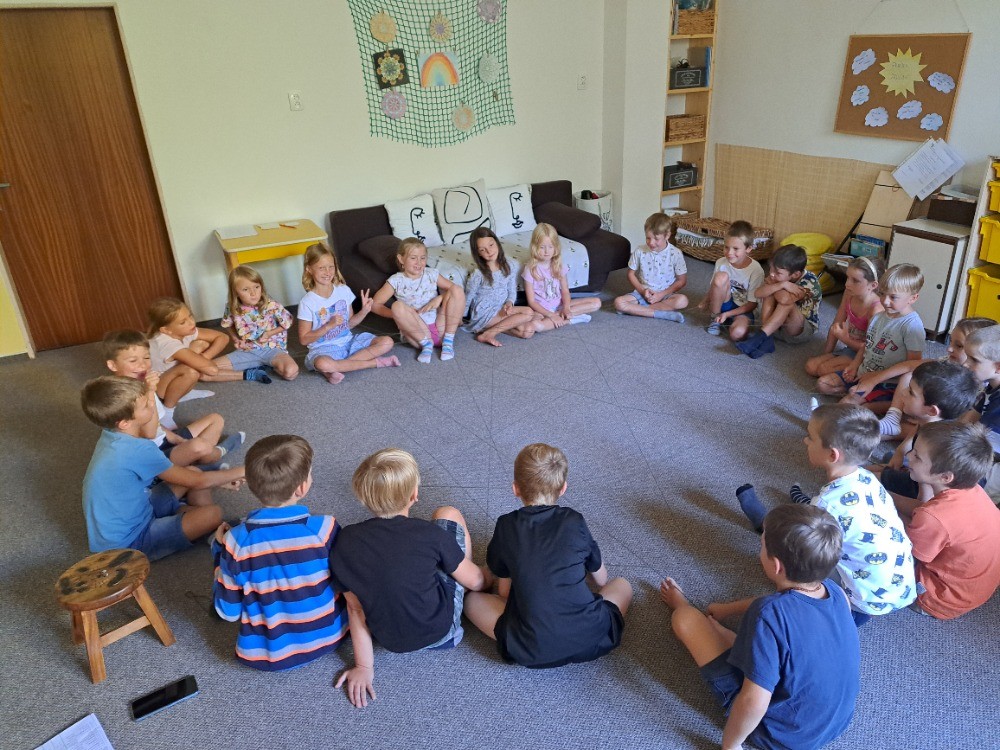 Hodně jsme využili pokračující teplé počasí a byly venku, kde se kluci hráli fotbal, někdo už se zápalem pracoval na PL, které dostal ve třídě. Pískoviště je stále oblíbené a v zákoutích zahrady se dobře probírají prázdninové zážitky, které i děti malovaly.