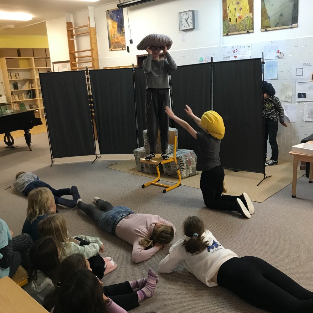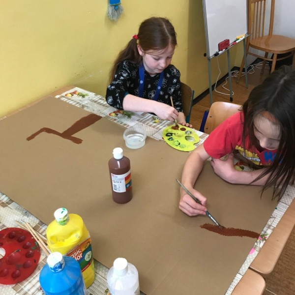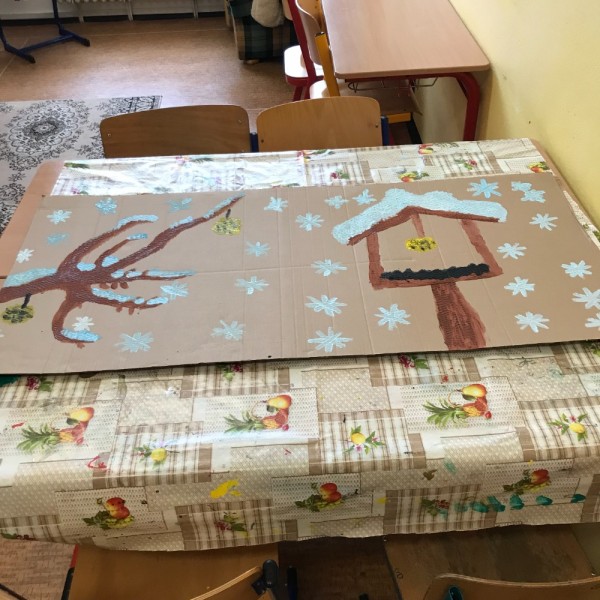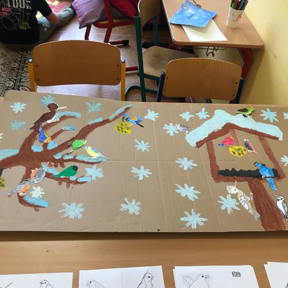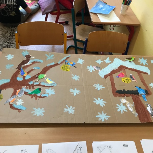 Namalovali jsme také krmítko a okolo si děti vybarvily a nalepily ptáčky. V pátek jsme četli na pokračování.